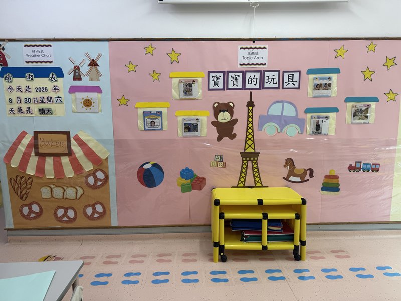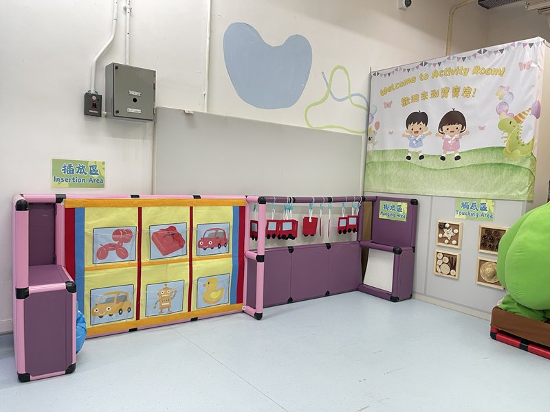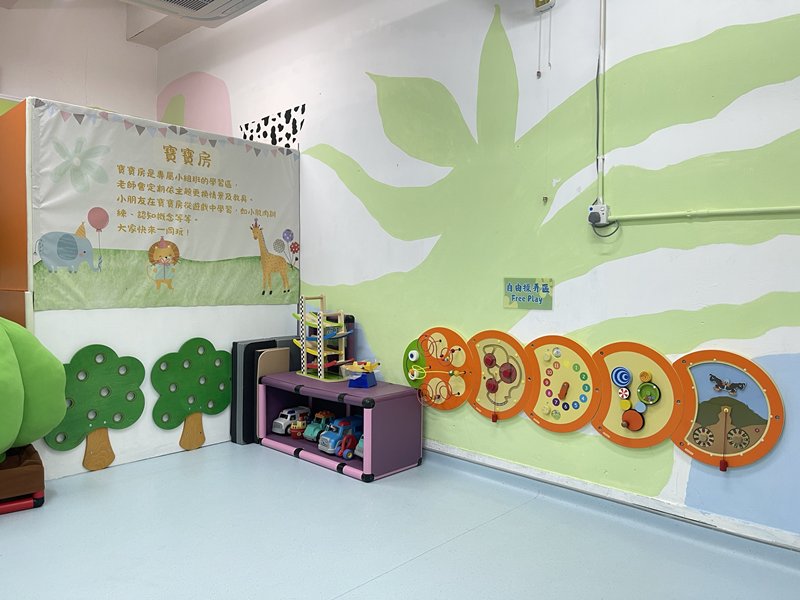 寶寶學習區是特別為2-3歲幼兒設計的情景化綜合遊戲活動,按幼兒的日常生活進行概念遊戲及小手肌遊戲訓練,如︰區角教具—夾衣夾、撕貼、觸摸等等,讓幼兒透過模擬遊戲及操弄教具,加強知識和技能,從中增強幼兒的溝通能力。